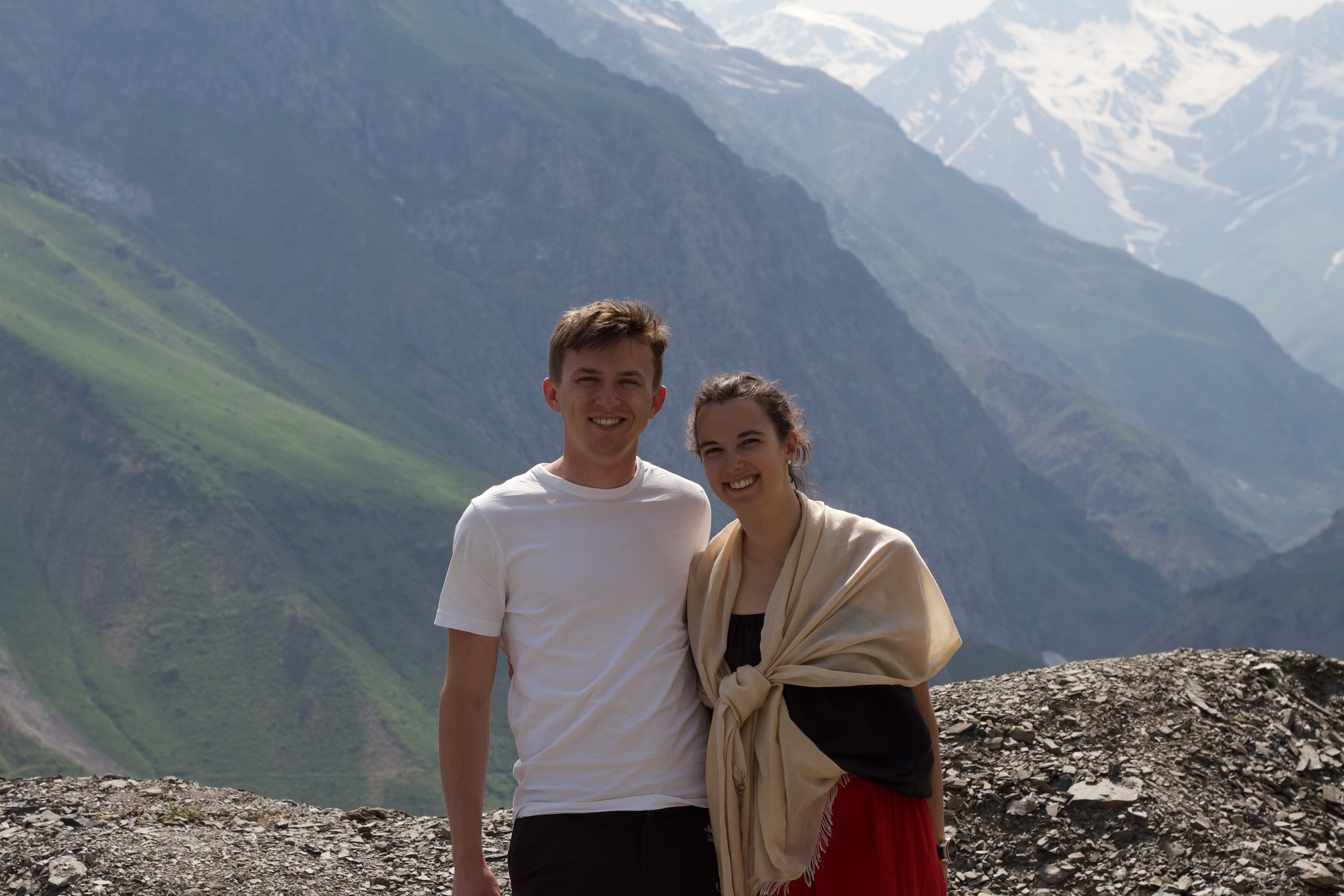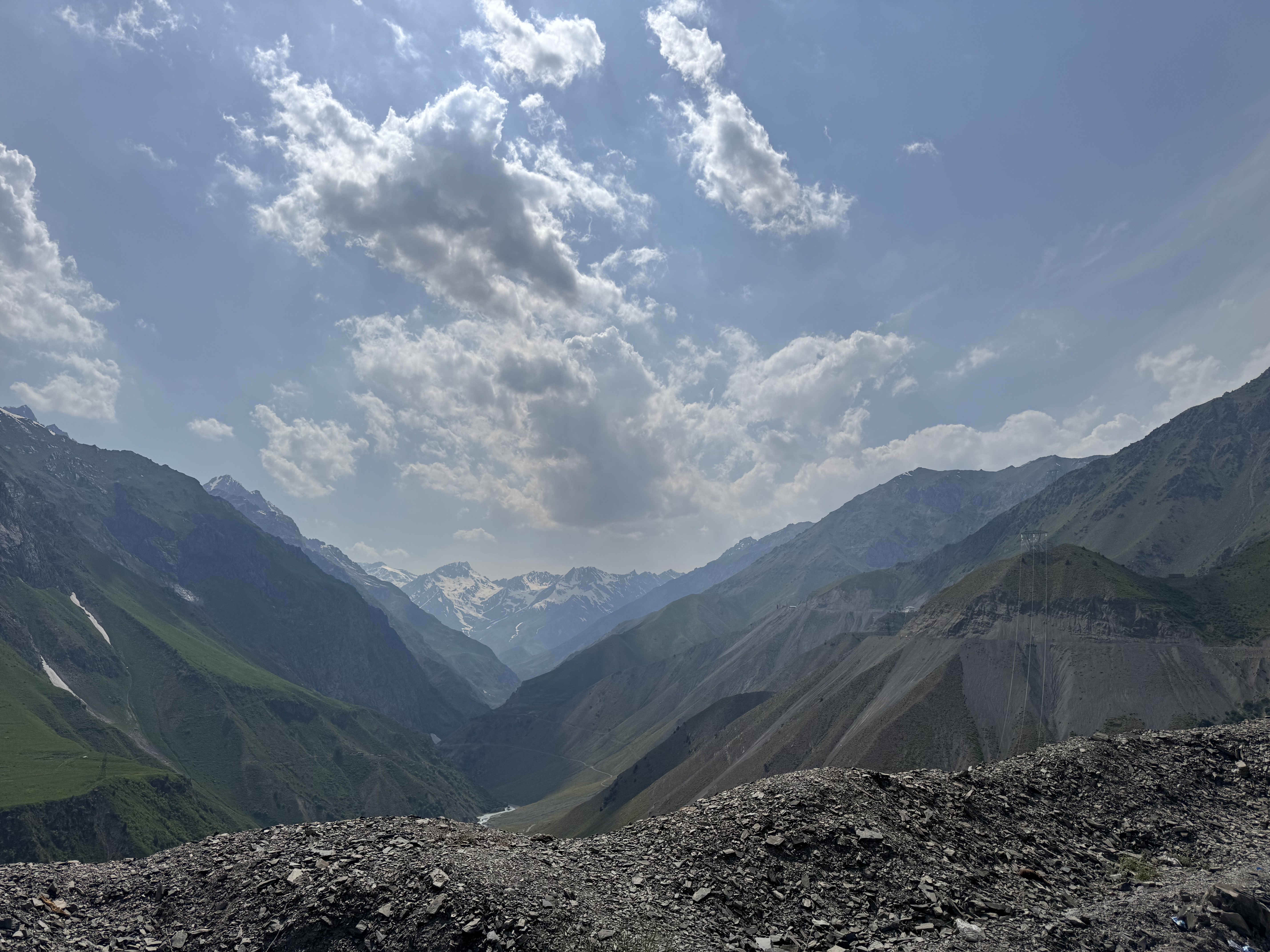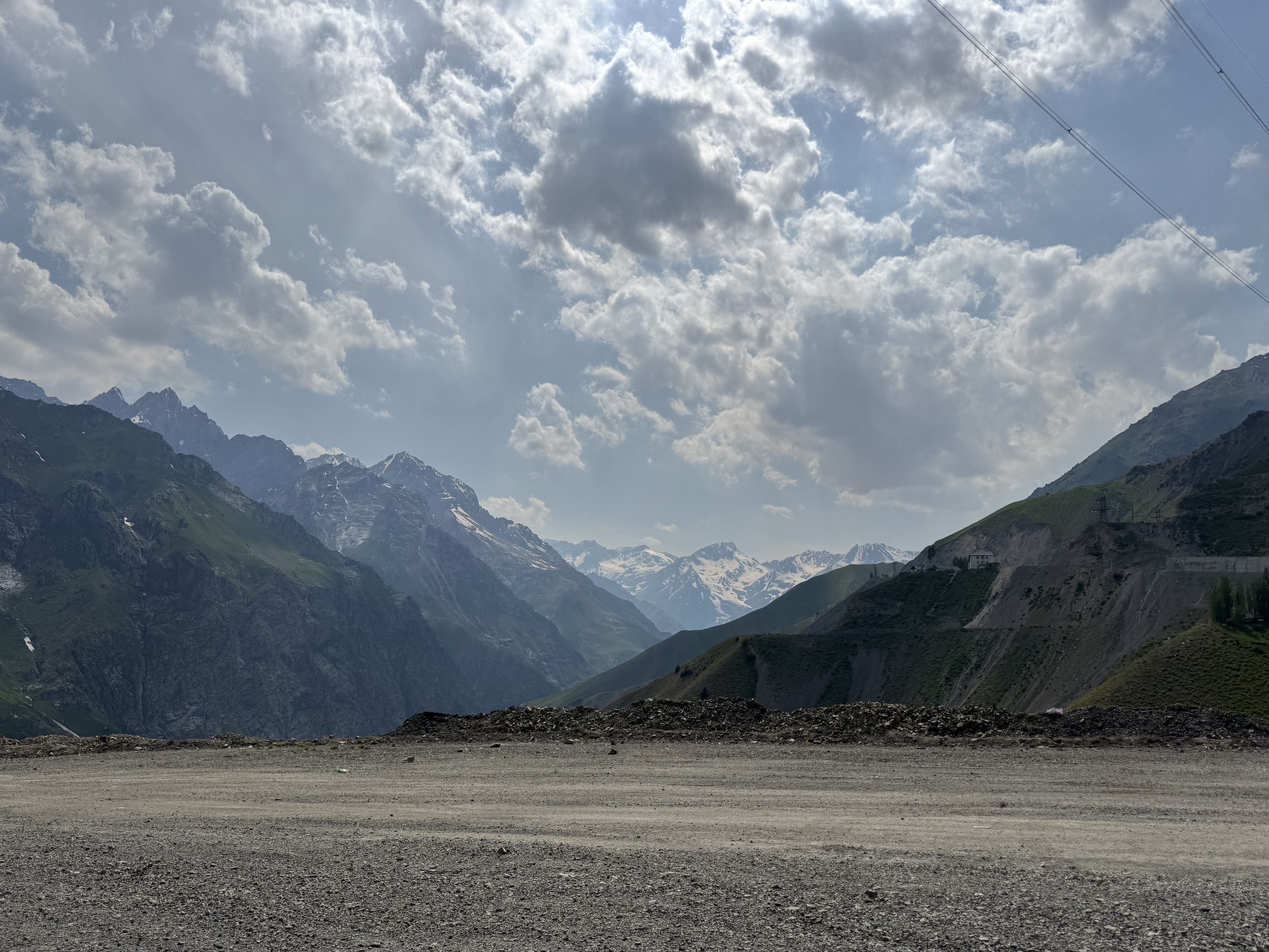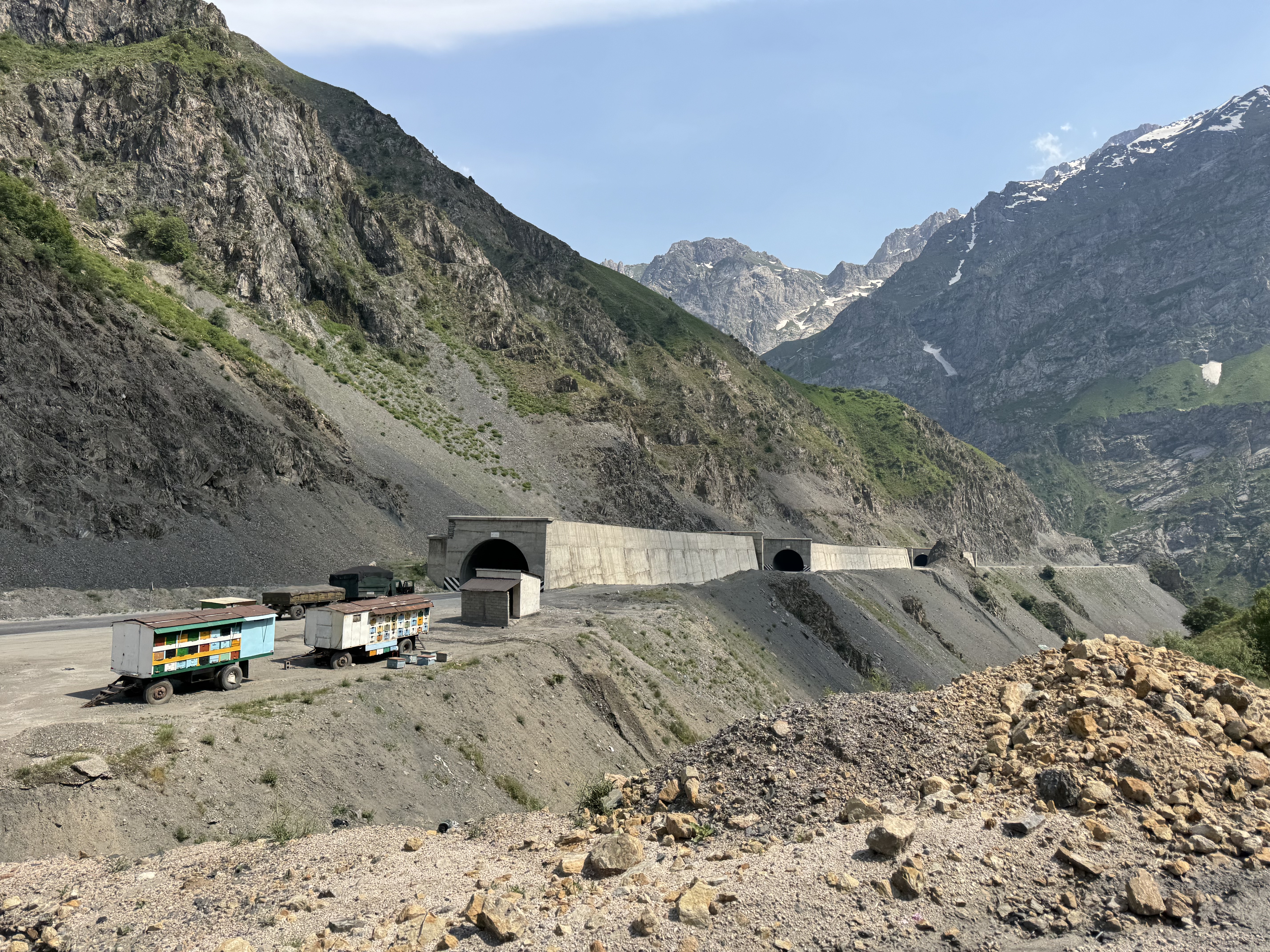 Après quelques heures de voiture, nous arrivons au fameux ou plutôt à l’infameux tunnel (parfois appelé tunnel de la mort). Le tunnel d’Anzob. Il s’agit d’un tunnel long de plus de 5km et à plus de 2700m d’altitude. Il n’est pas éclairé, est en pente et la ventilation n’est pas fonctionnelle ce qui rend la traversée dangereuse car la pollution y est extrêmement forte. Il y a plusieurs années, un cycliste a tenté la traversée, mais il est mort à cause de la pollution des gaz d’échappements lors d’un bouchon. Depuis, la traversée est interdite aux cyclistes et un militaire force les camions à prendre en stop les cyclistes pour le passage dudit tunnel. Nous sommes bien contents d’être dans notre petite voiture pour le trajet.