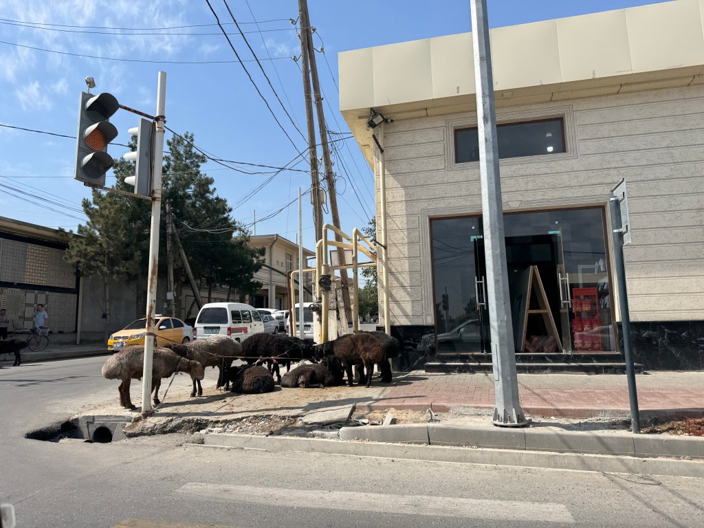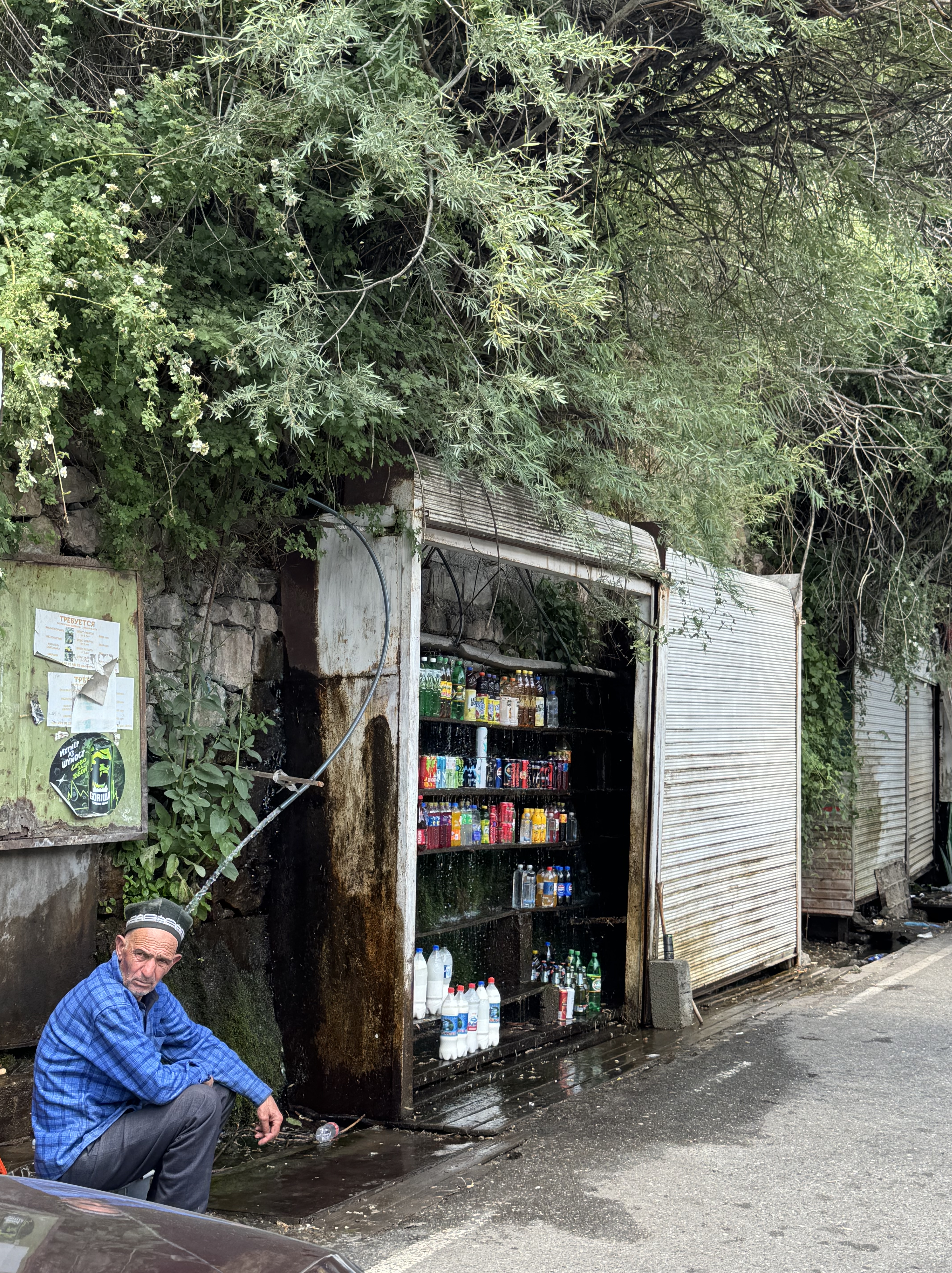 Vingt kilomètres plus loin se trouve la ville de Penjakent. Nos collègues de taxi veulent s’arrêter pour acheter à manger. On fait donc une petite pause. Nathan et moi sommes un peu flippés de manger de la nourriture de rue (ça a l’air craignos honnêtement) et on n’ose pas trop s’éloigner du taxi (les autres occupants du taxi ne parlent pas anglais, la communication est donc limitée). On décide de tenir le coup à coup d’eau que nous avions acheté la veille. Insh’allah !