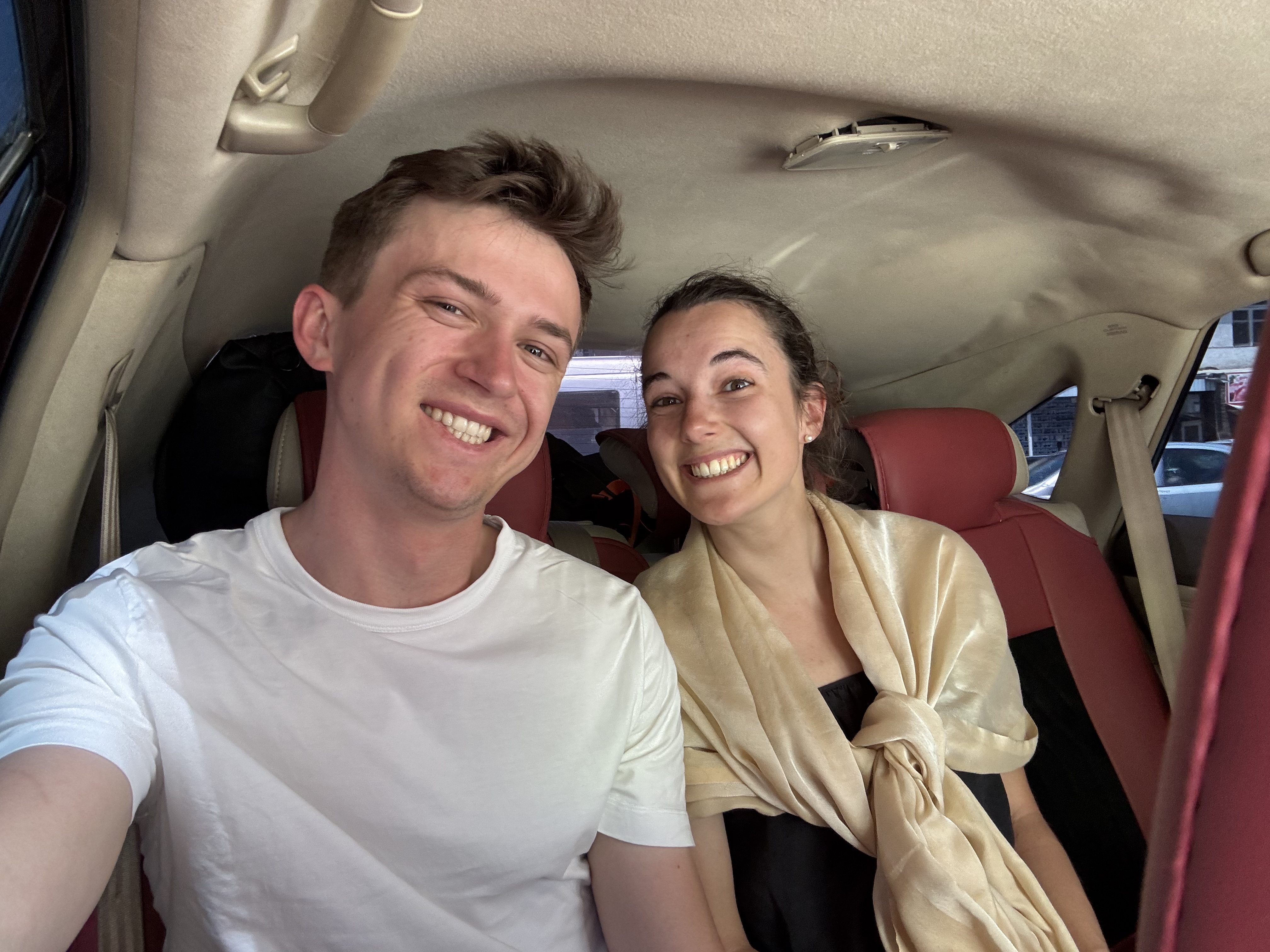 Les vélos sont installés à la verticale et ça fait assez peur, sachant que le trajet devrait durer cinq heures… Trop tard pour reculer. Le chauffeur et l’homme du couple qui partage notre taxi attachent nos vélos de manière plutôt professionnelle et ça à étonnamment l’air de tenir. Je m’installe au siège du milieu arrière, à côté d’une femme et Nathan se met de l’autre côté. Nous voilà partis pour cinq heures de voiture avec nos vélos accrochés sur le toit. Pourvu qu’ils tiennent !
