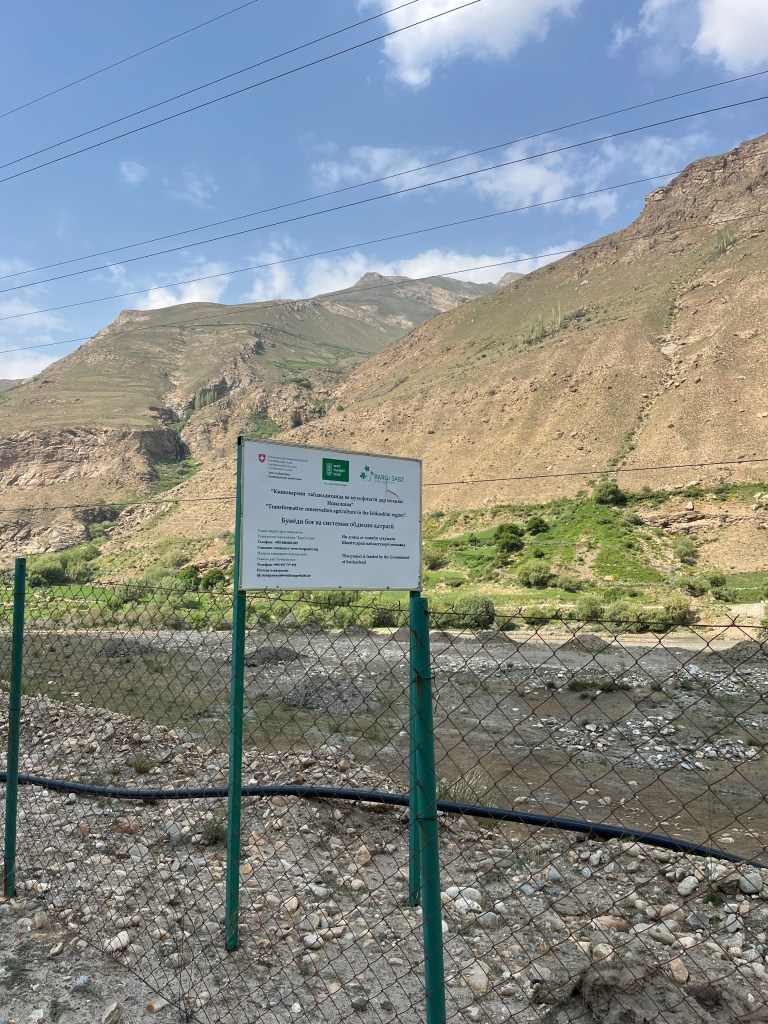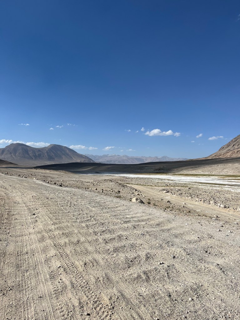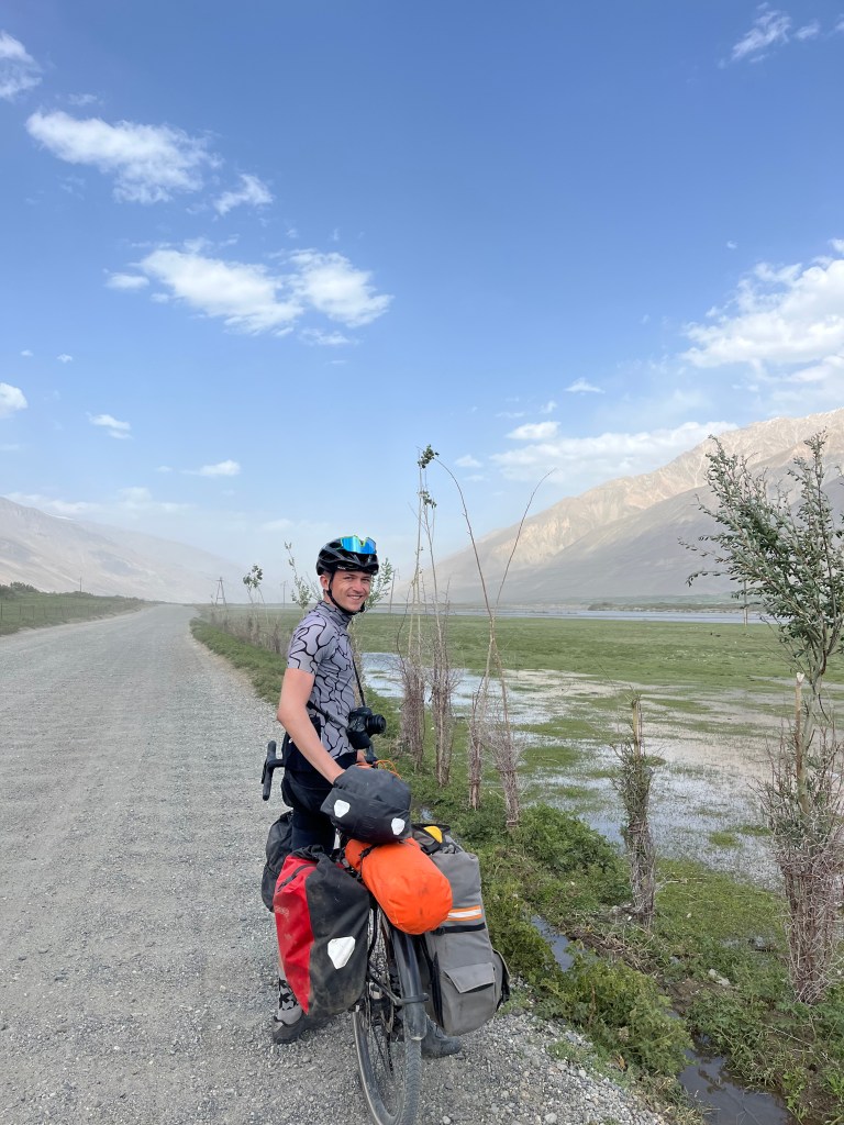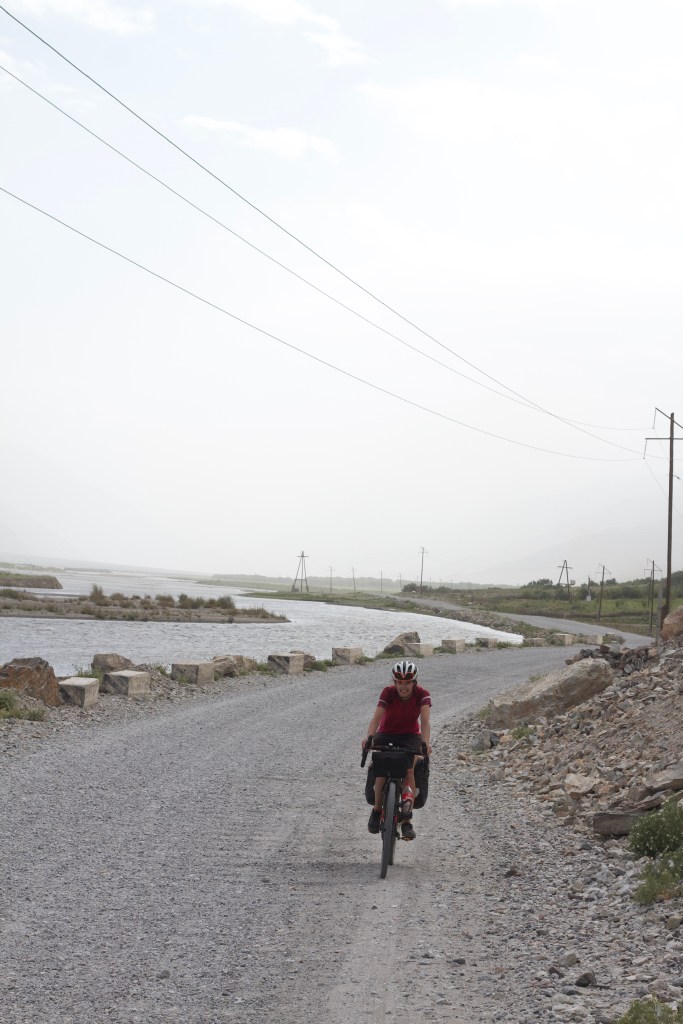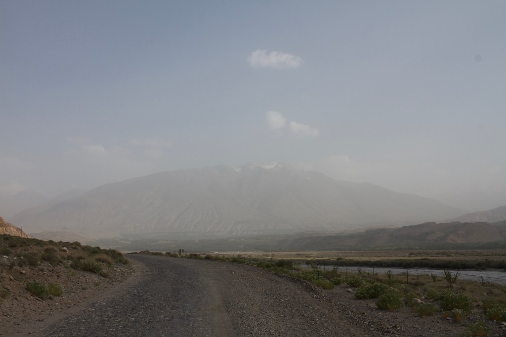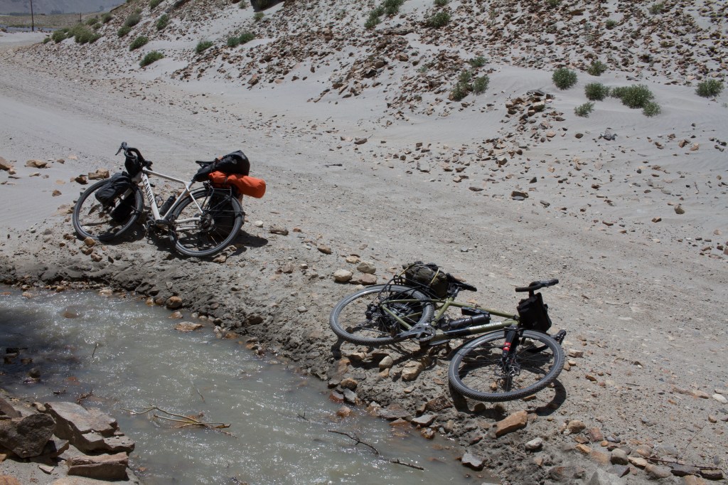 Le lendemain, on est prêts pour affronter les trente kilomètres qui nous séparent de Langar. La piste est encore pire que la veille et mon estomac pas bien remis encore. C’est très dur. On avance ultra lentement. On croise Alex qui galère aussi sur cette surface et il nous apprend que Victor devrait bientôt nous rattraper. On le laisse filer à Langar tandis qu’on se fait une pause repas au bord d’une rivière. On arrive finalement à Langar en milieu d’aprèm, on aura donc mis la journée à faire ces trente kilomètres d’enfer. Victor est toujours derrière et on s’inquiète un peu. On retrouve Alex à Langar.