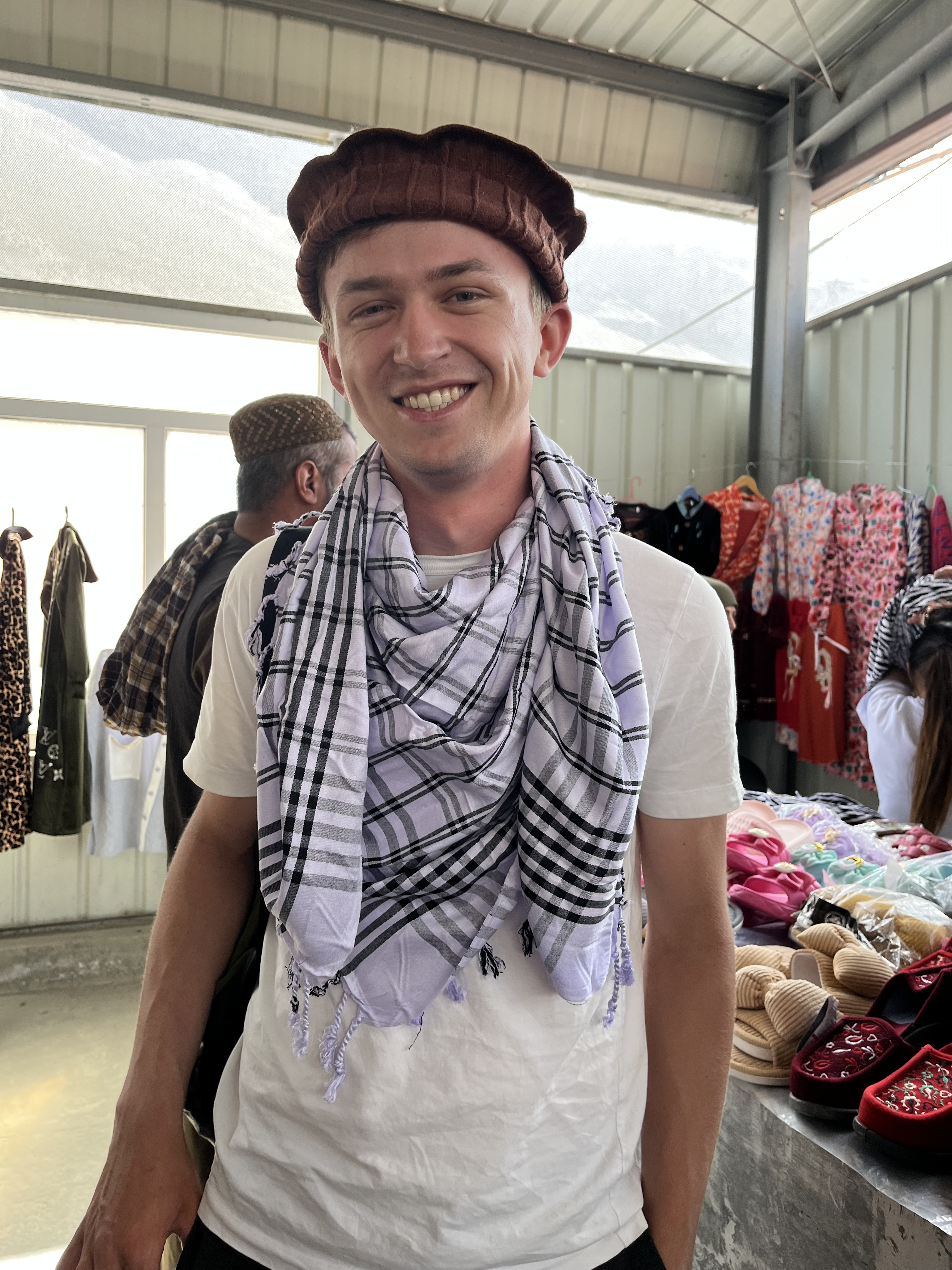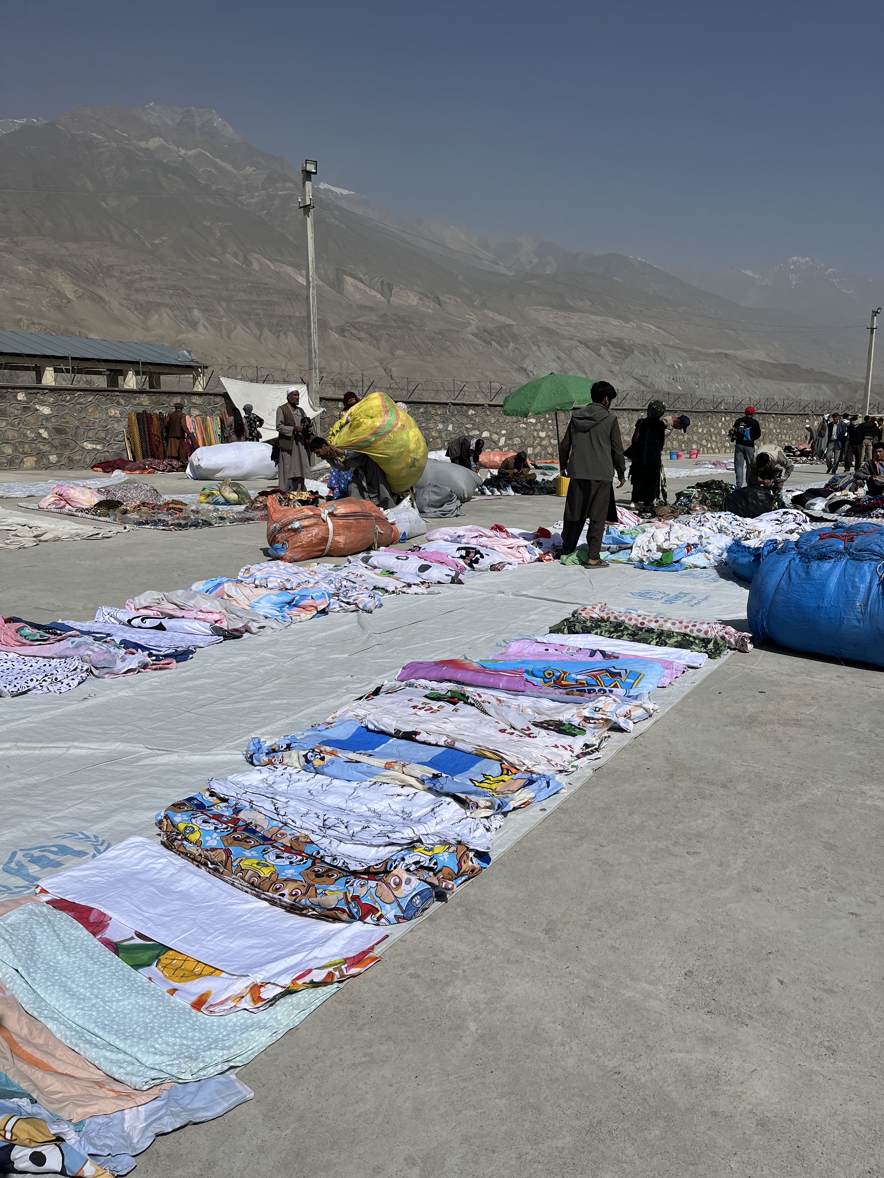 Après un petit-déjeuner un peu trop simple à notre goût, on part pour le Bazaar Afghan. On peine un peu à négocier un taxi et arrivons entier à destination après une conduite bien rapide. On montre nos passeports aux militaires et découvrons, côté afghan, une file interminable ! Les afghans viennent ici vendre leur biens aux tadjiks et, peut-être aussi, découvrir un peu du monde extérieur et parler en anglais aux touristes. On y achète des bananes afghanes et du pain tadjik et Nathan se fait habiller par un Afghan de manière traditionnelle.