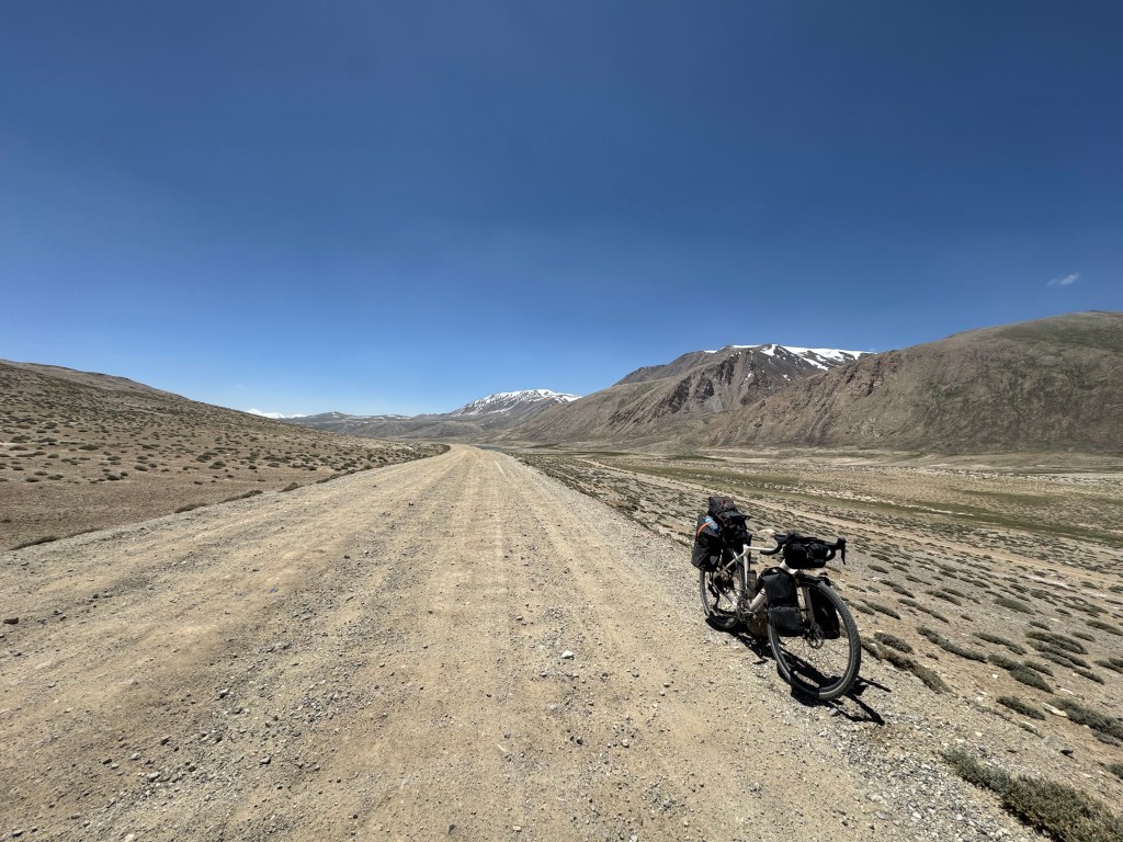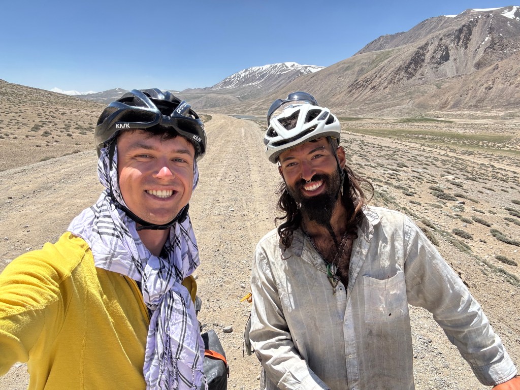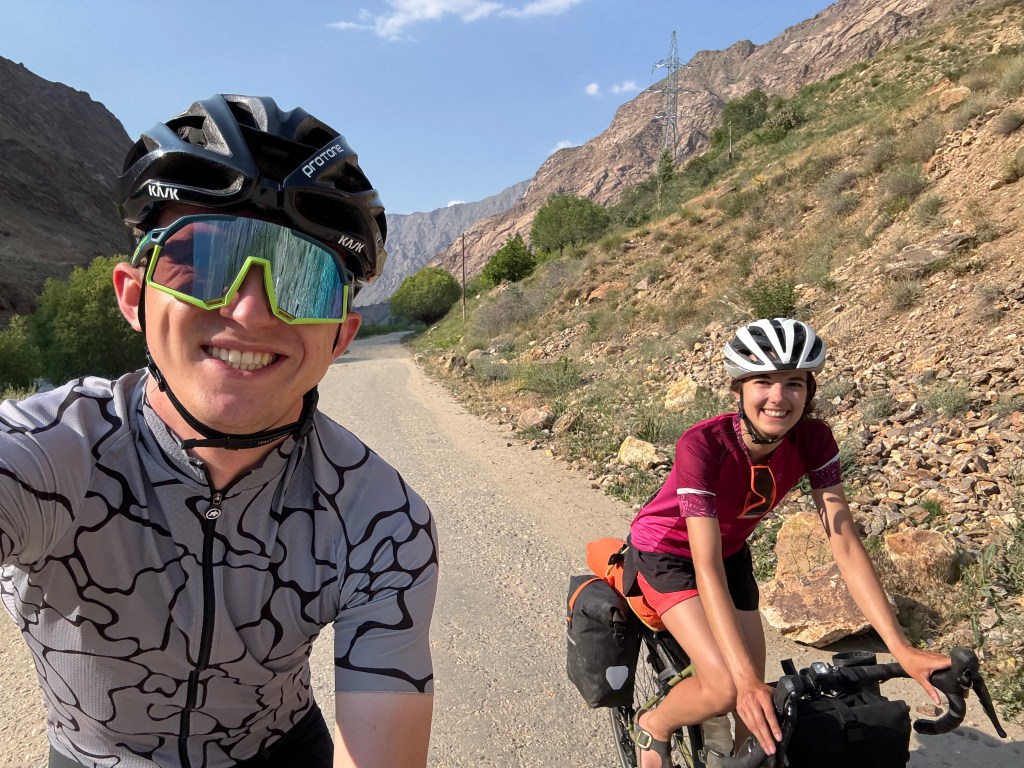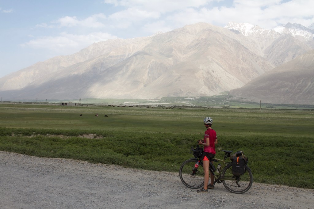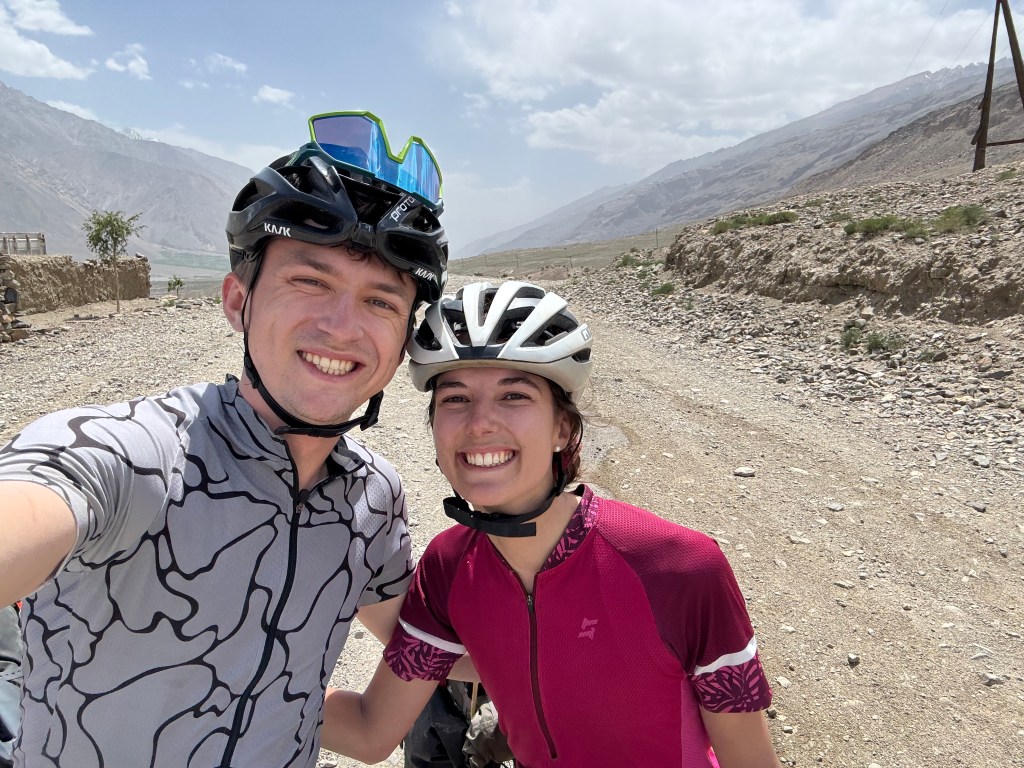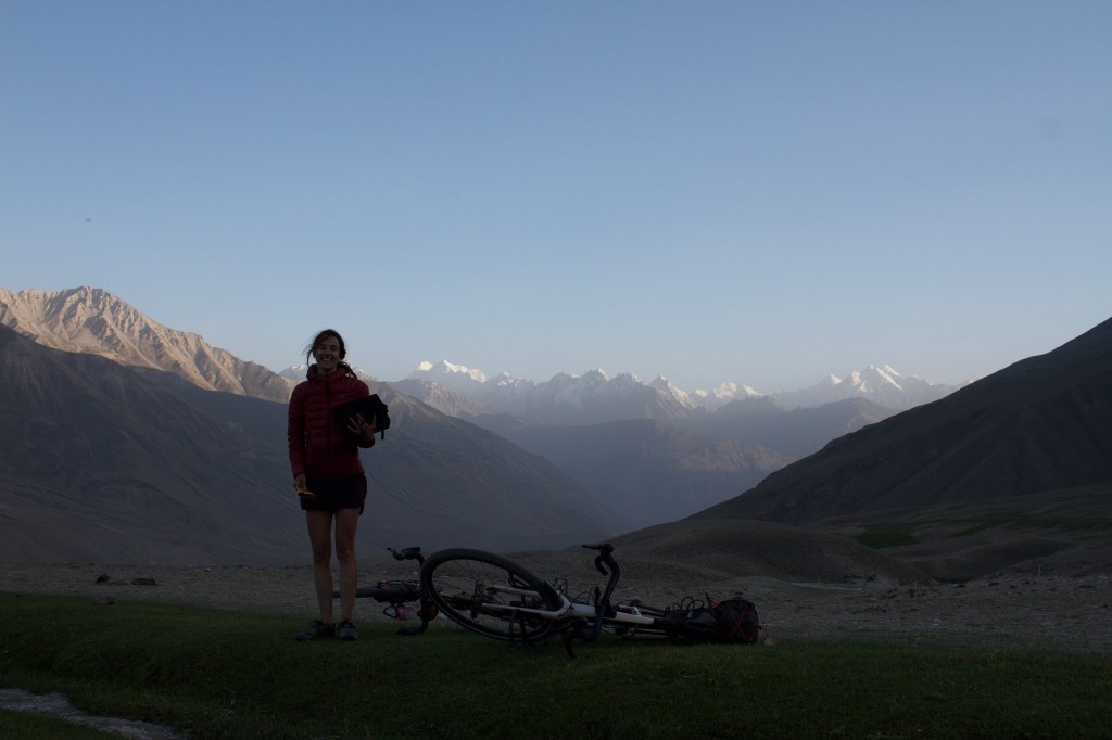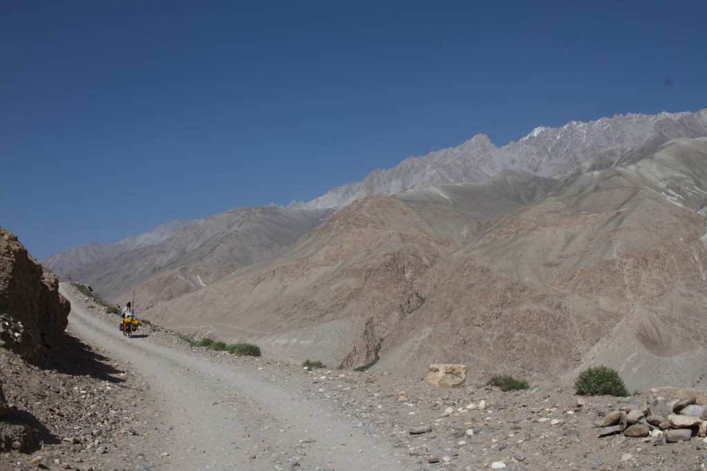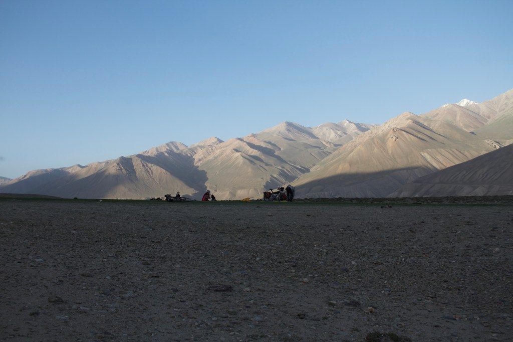 La chaleur est encore très présente mais le soleil descend gentiment. On monte ces premiers kilomètres extrêmement pentus. On doit beaucoup pousser le vélo, la pente est vraiment impressionnante. On prend de la hauteur super vite ! On fait la course avec le soleil pour camper avant la nuit et le froid glacial qui l’accompagne. En montant, on croise un tadjik qui descend de on-ne-sait-où avec sa pelle, sur son vélo. On en croise plusieurs des hommes comme ça et on ne comprend pas bien où ils travaillent et ce qu’ils font. Peut-être construisent—ils les murets militaires ?