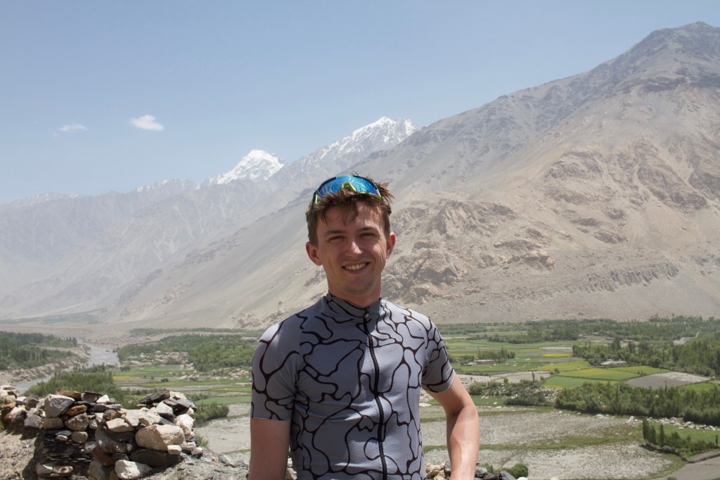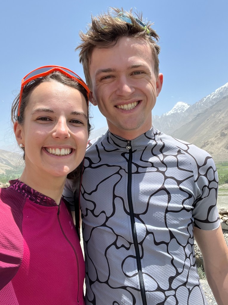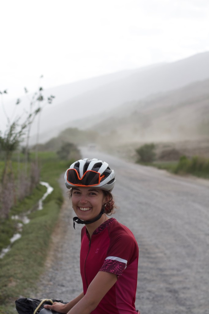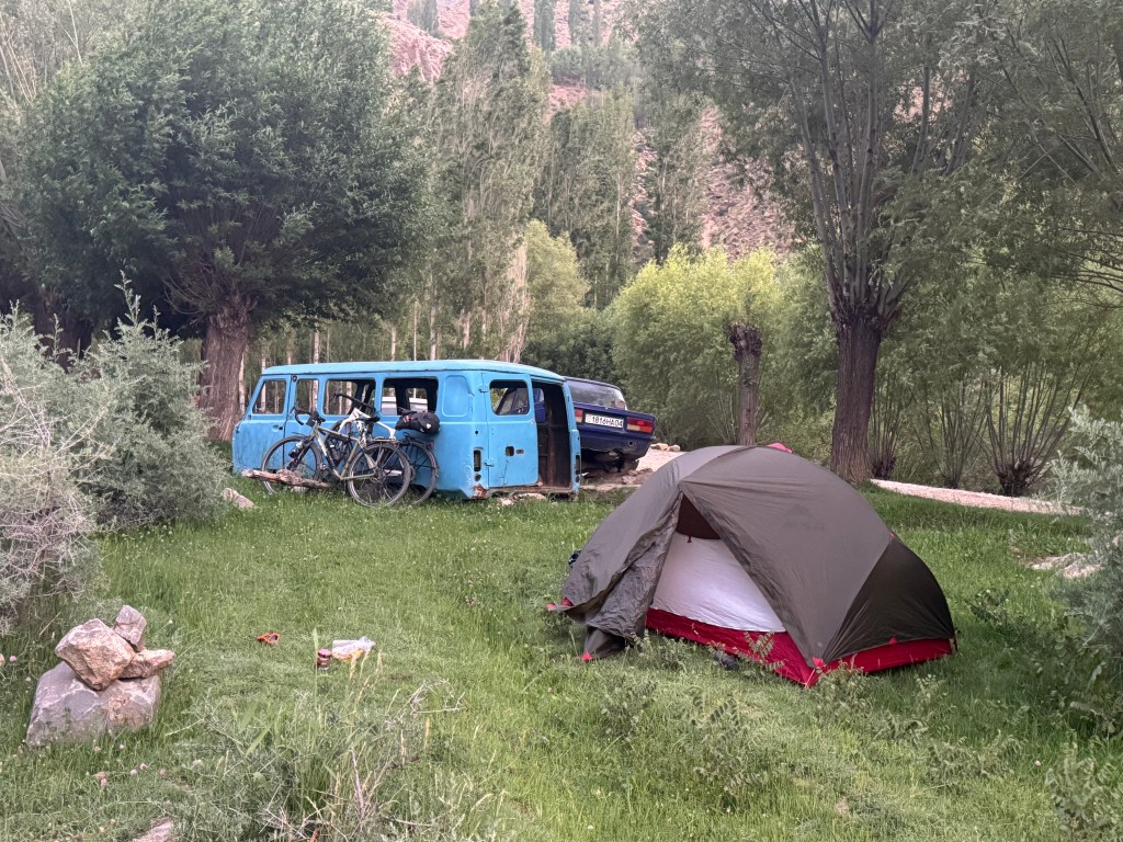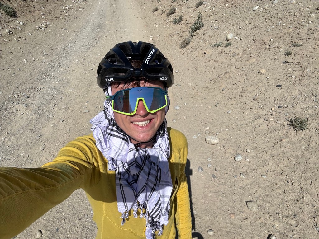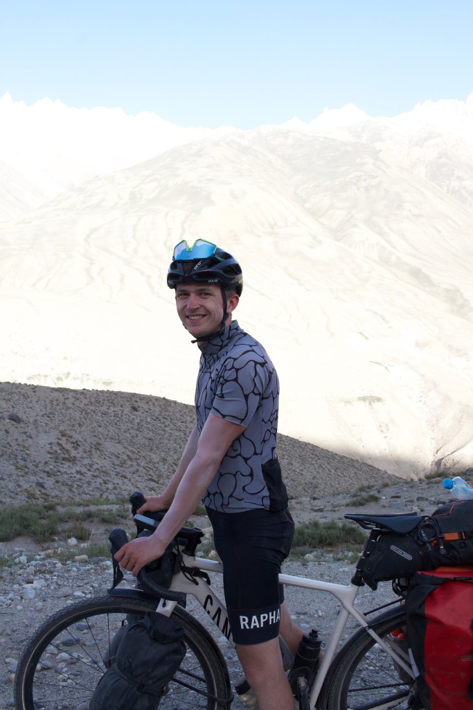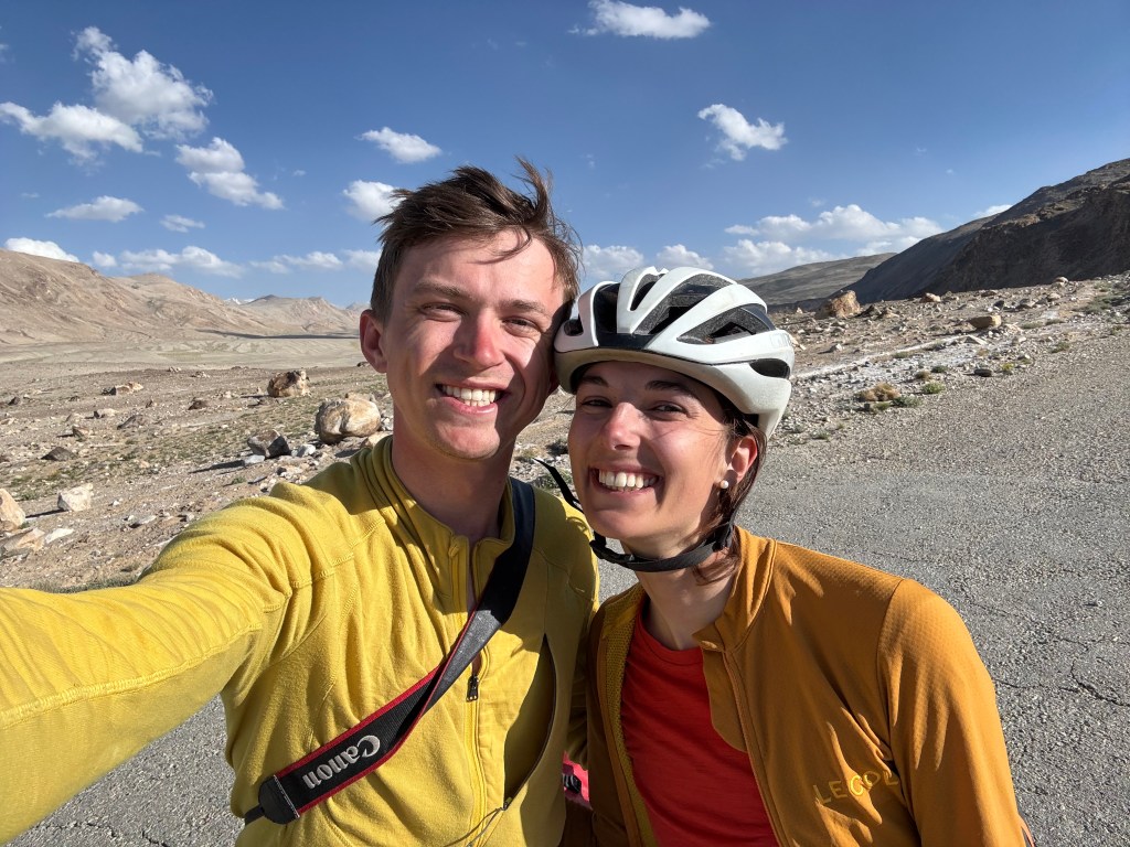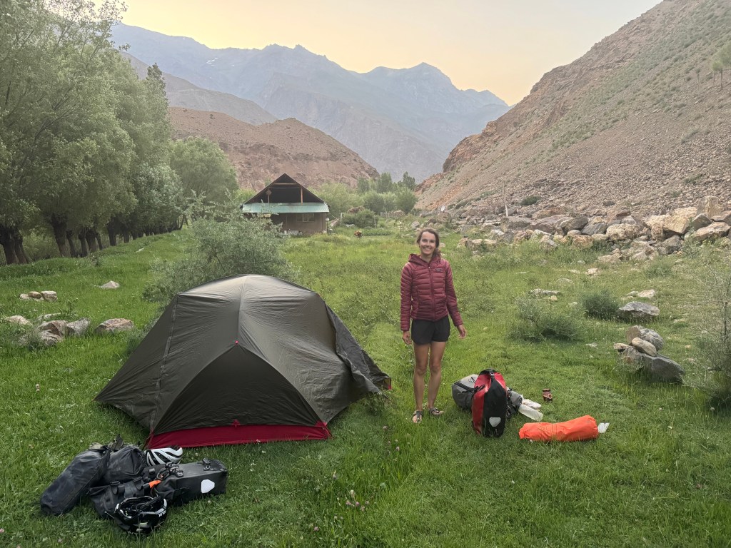 La chaleur est encore très présente mais le soleil descend gentiment. On monte ces premiers kilomètres extrêmement pentus. On doit beaucoup pousser le vélo, la pente est vraiment impressionnante. On prend de la hauteur super vite ! On fait la course avec le soleil pour camper avant la nuit et le froid glacial qui l’accompagne. En montant, on croise un tadjik qui descend de on-ne-sait-où avec sa pelle, sur son vélo. On en croise plusieurs des hommes comme ça et on ne comprend pas bien où ils travaillent et ce qu’ils font. Peut-être construisent—ils les murets militaires ?