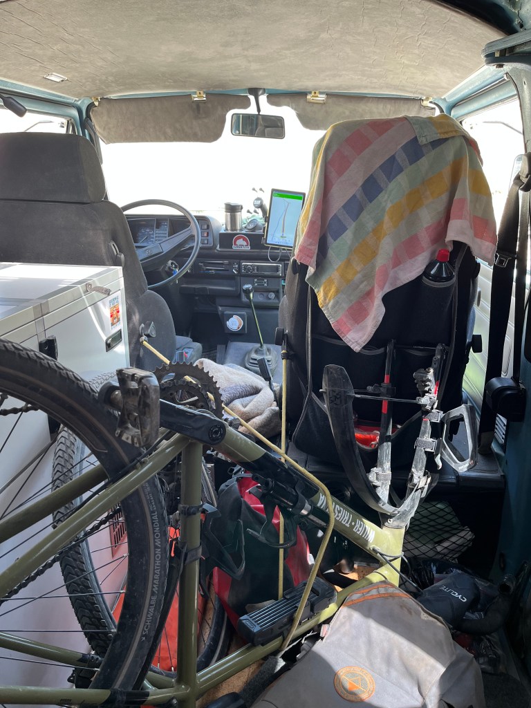Au réveil, c’est vraiiiiment dur d’émerger. Victor se réveille légèrement plus tard que nous mais nous rattrapera en route. On enfourche les vélos, mais je sens qu’avec ma petite nuit, j’ai rien récupéré et je suis toujours aussi explosée que la veille. Après 5km, j’abdique et annonce à Nathan que je veux tenter de faire du stop (il n’y a quasi aucune voiture qui passe ici). On avance tant qu’il n’y a pas de voitures et voilà qu’un van VW allemand arrive au loin. On a déjà un peu discuté avec eux, ils sont très sympas. On les arrête et je leur explique la situation. Ils sont un peu frileux à l’idée d’avoir nos deux vélos dans leur van. On pense qu’il ont peur qu’on degueulasse tout. C’est probablement en partie vrai. Ils acceptent généreusement de prendre mon vélo et moi-même, tandis que Nathan franchira le col à vélo. Ça le rend très heureux de tout faire à vélo, et je suis très heureuse de cette pause. On se donne rendez-vous à un lac sur la descente du col et je lui souhaite bonne chance.