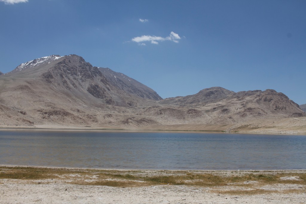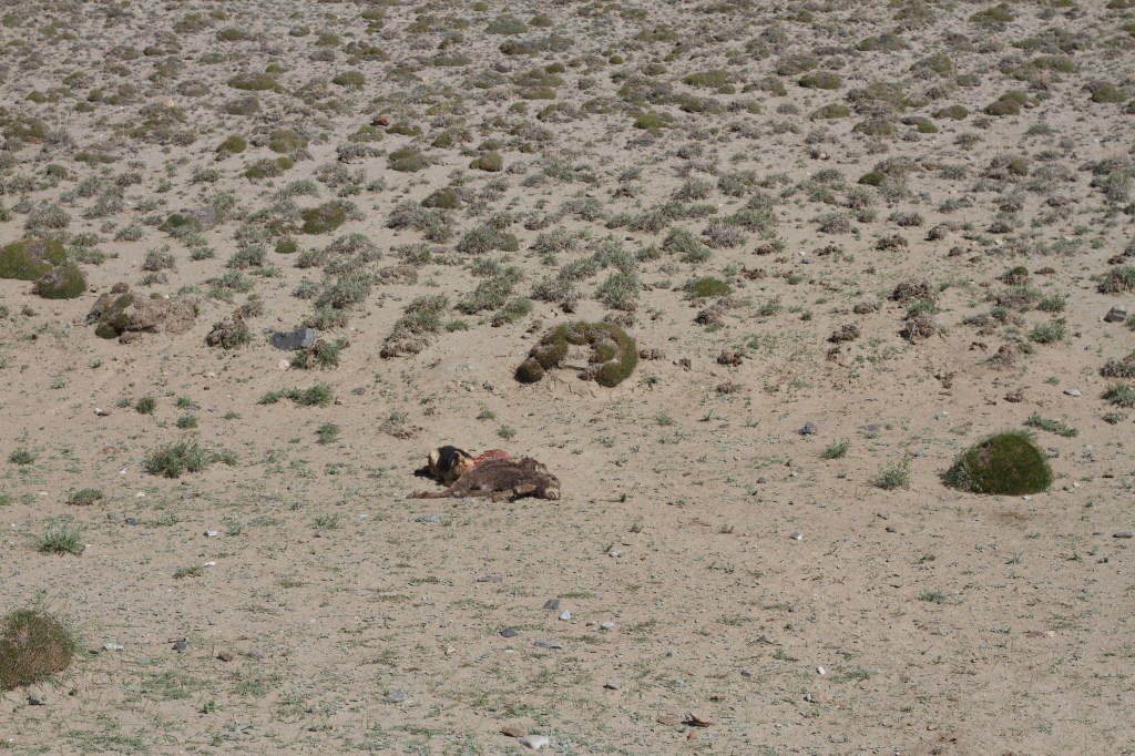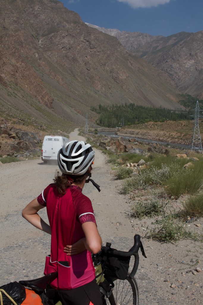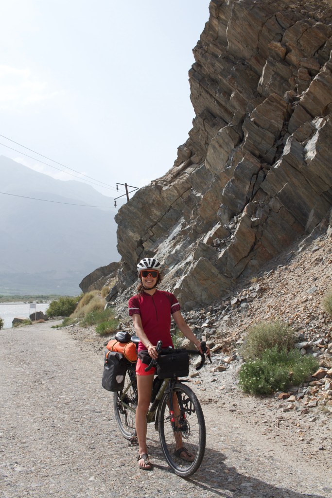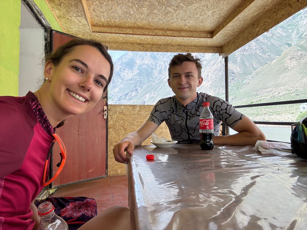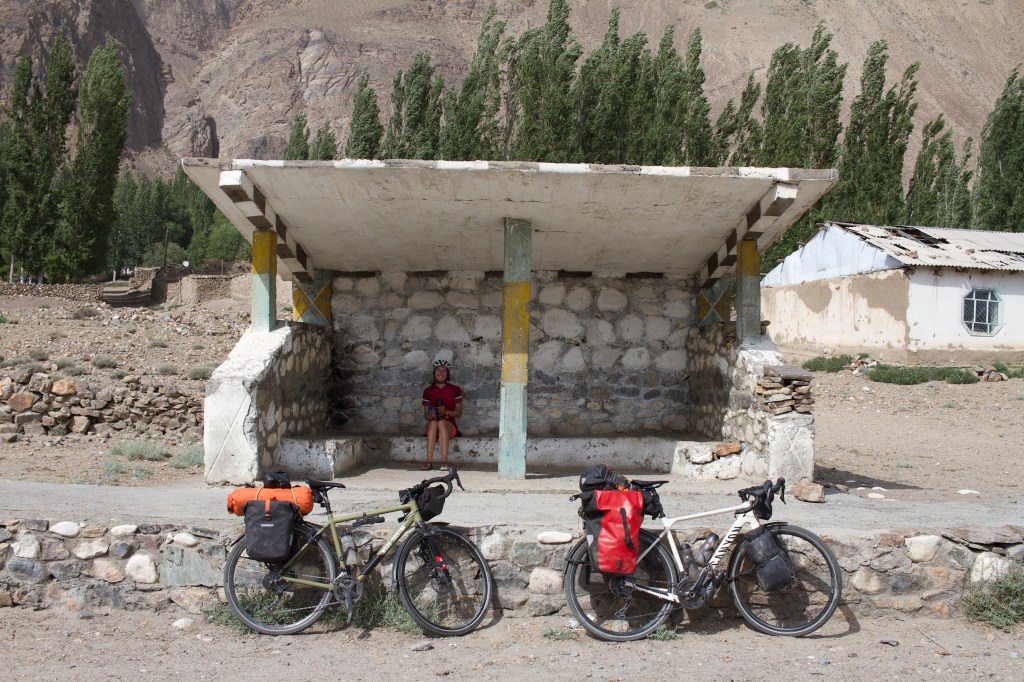 La route est dans un état acceptable mais qui se détériore au fil du chemin. Le paysage est magnifique. On rattrape un moment Alex et roulons un peu ensemble. On s’arrête avant lui pour dîner, tandis qu’il continue dans la chaleur. La température est effrayante et nous ne savons plus comment faire pour avancer. Il est quasi impossible de trouver de l’ombre, c’est désertique. On s’arrête chaque kilomètre, descendons un bout de talus/falaise de la route pour s’abriter un peu à l’ombre… on fait plus beaucoup d’avance car il fait trop chaud. On sent notre peau brûler, surtout que la crème solaire tadjike est absolument inefficace. On est à bout, comme passés au rouleau compresseur. On s’entend sur le fait qu’il faut trouver un endroit où camper et basta.