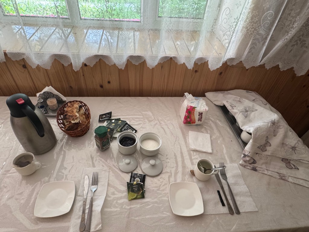 On se met donc en route au pic de chaleur mais arrivons étonnamment bien à rouler. La route n’est pas aussi mauvaise que prévu pour l’instant et le paysage est très beau. On croise des jeunes filles qui promènent leur chèvre en laisse. La chèvre réussit à s’échapper et une jolie course poursuite a lieu à nos côtés. Pour camper, c’est difficile car les militaires sont réputés déloger les campeurs qui sont trop proche de la frontière à leur goût. Comme nous la longeons, la tâche est compliquée. On finit par s’éloigner sur une route Gravel et des locaux acceptent que l’on campe dans leur jardin.