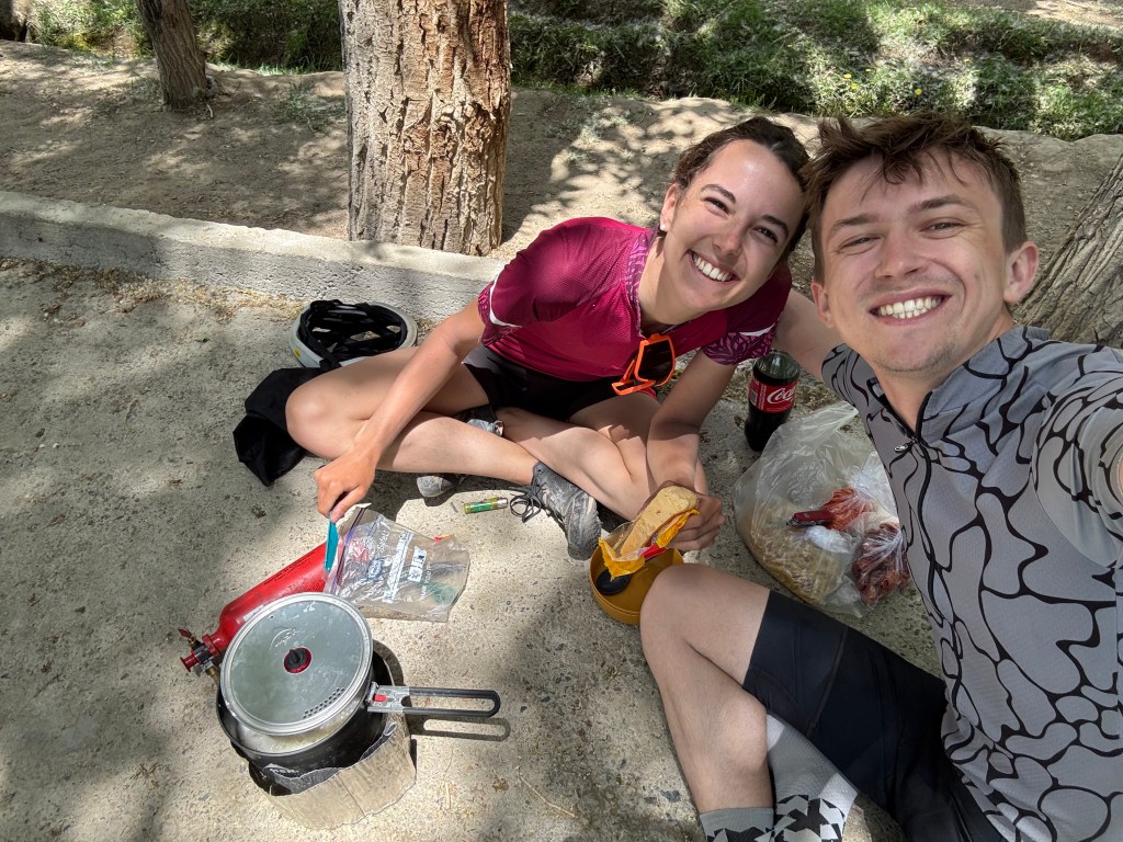 Nathan est mega motivé à entamer la montée du gros col de Khargush, moi je suis épuisée de la journée mais comme notre temps est limité dans le pays, je me motive à le suivre. On laisse Alex derrière qui veut attendre Victor et on fait un dernier plein d’eau. Victor arrive à ce moment-là, il a l’air rincé, encore plus que moi ! Il en peut plus et ne veut pas monter le col ce soir. Alex décide alors de nous suivre.