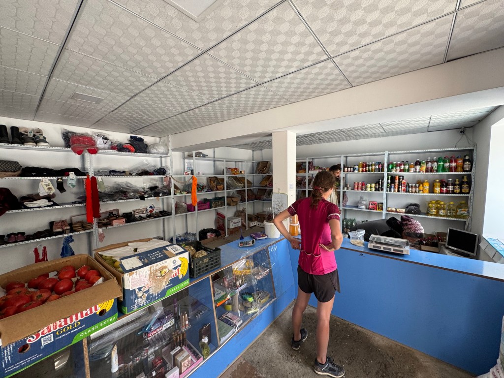On trouve des magasins pour faire le plein avant le gros col qui nous attend et que l’on prévoir de faire en trois jours (y compris la fin de journée en question). On cherche désespérément du pain et le magasinier auprès duquel on achète tout notre stock a pitié de nous et va en chercher quelque part dans le village. Il revient avec deux énormes pain, un pour Alex et un pour nous et nous les offre !