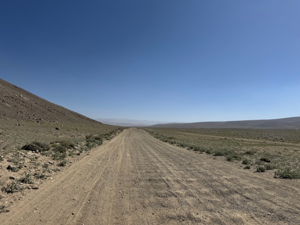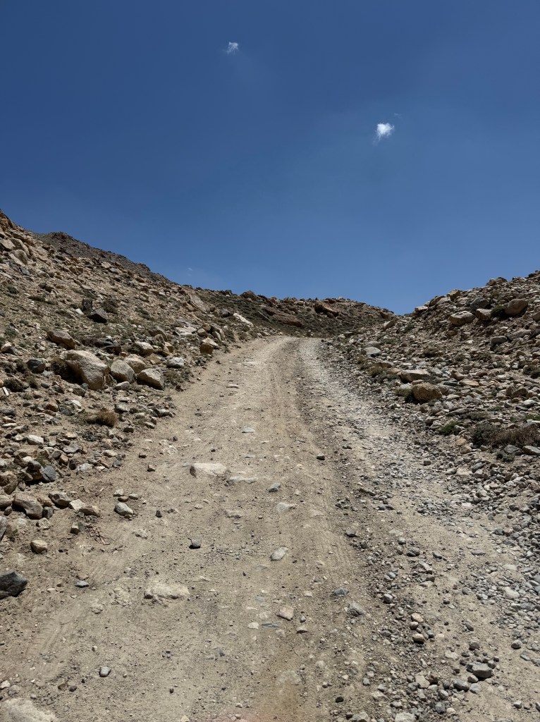 Au réveil, Alex est plus rapide à partir (il ne déjeune pas, car il est en mode budget ultra mega serré – à savoir qu’il a vécu à la rue plusieurs années en Suisse lors de ses études à l’EPFL). On le laisse prendre les devants et on le suit une fois le campement levé. La route est superbe mais à 7h, il fait déjà bien chaud alors que l’on a campé à 3400m !