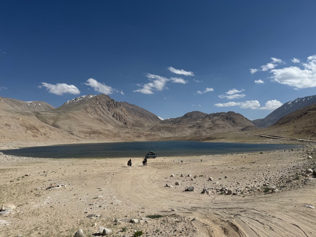 Comme il est encore tôt, nous décidons de repartir à vélo plus loin, les quatre cyclistes. Les allemands décident, eux, de rester camper près du lac. Je les remercie chaleureusement et on s’en va sur nos vélos à l’assaut du reste de la descente du col, pleine de tôle ondulée.
